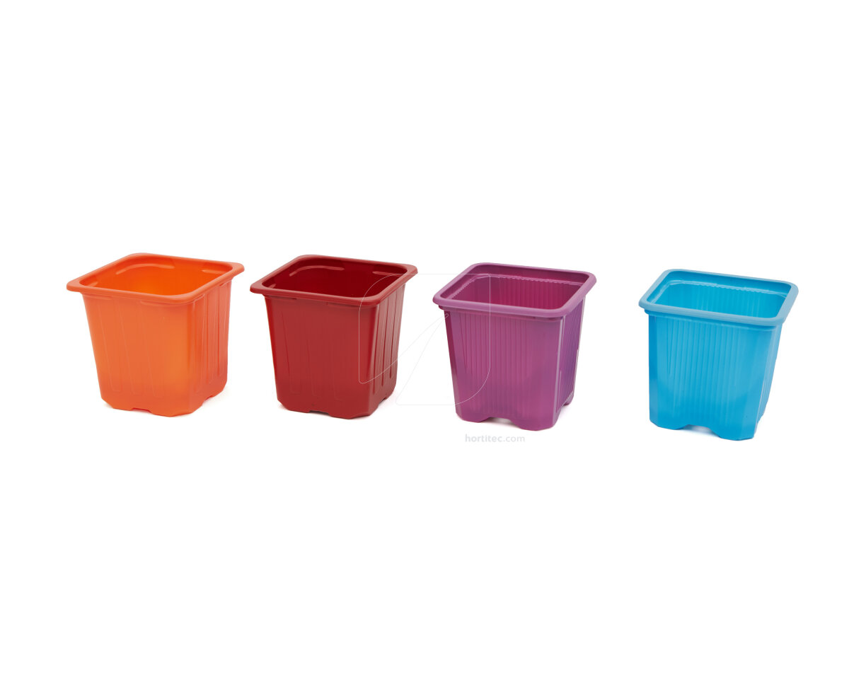 Las macetas cuadradas de colores están disponibles en naranja, azul, amarillo y violeta, aunque éstos pueden variar. Todos ellos con un mismo tamaño: 7 x 7 x 6,5 cm