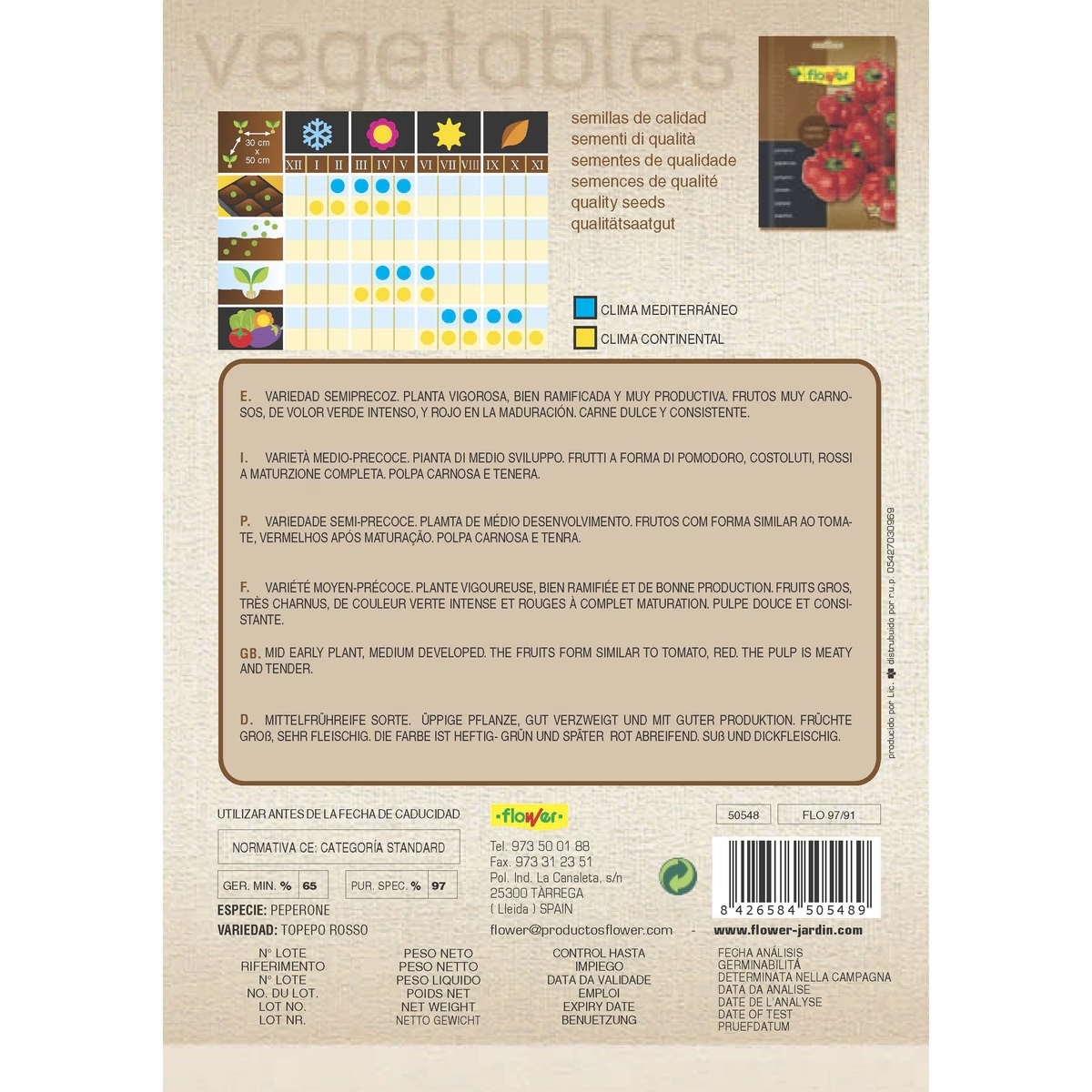 Pimiento Morrón de Flower es una variedad de pimiento morrón, específicamente de la especie peperone, conocida por su vigor y alta productividad. La variedad semiprecoz Topepo Rosso se distingue por su planta robusta, bien ramificada y de crecimiento vigoroso, que garantiza un rendimiento óptimo. Los frutos son carnosos, con un color verde intenso que se transforma en rojo durante la maduración, presentando una carne dulce y consistente.